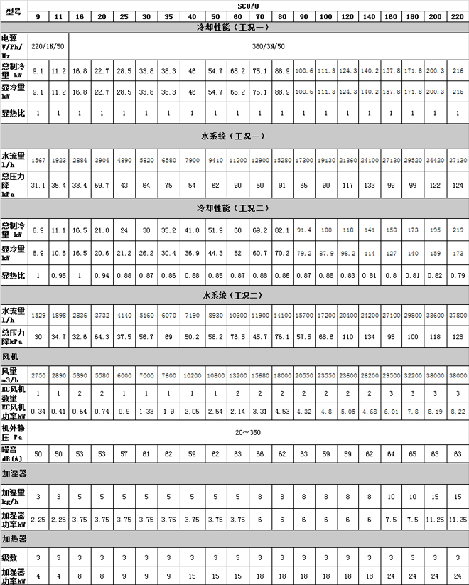 (4)- 表格中電加熱量與加濕量為標(biāo)準(zhǔn)配置,如客戶需要增大機(jī)組加熱或加濕能力,請咨詢與我公司。