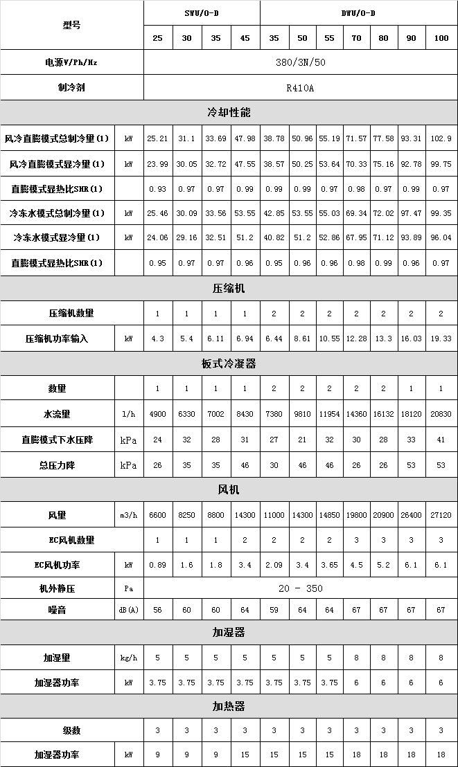 (1)- 回風(fēng):24°C,相對濕度50%,進(jìn)出水溫度:30/35°C,機(jī)外余壓:20Pa